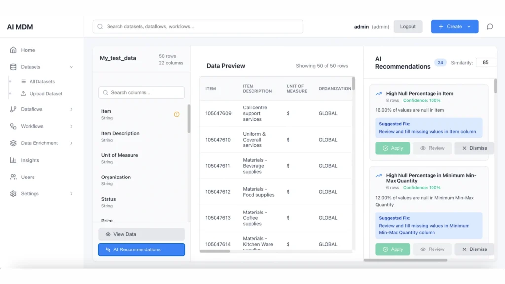 Trinamix AI automatically analyzes every dataset as soon as it is uploaded, identifying data quality issues, inconsistencies, and risk areas without manual setup. Business teams instantly understand what’s wrong with incoming data and where attention is needed before poor data affects downstream systems.