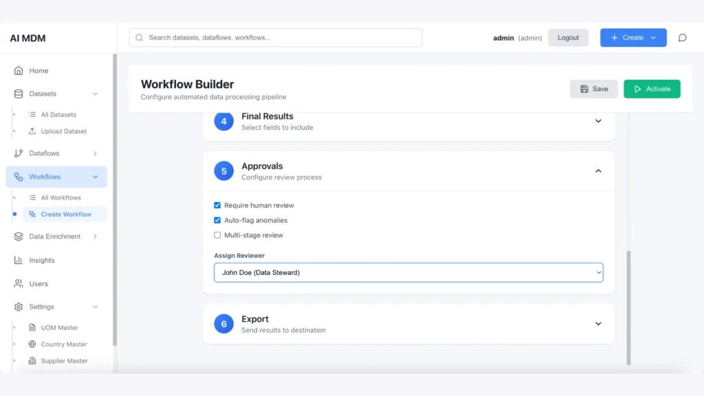 Instead of hard-coded rules or black-box automation, Trinamix AI MDM allows users to configure how AI-driven matching and deduplication behaves. Data teams can define similarity thresholds for fuzzy matching, set confidence levels for auto-applying fixes, and enable or disable AI recommendations based on governance needs.