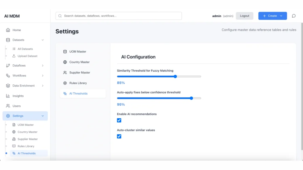 Yes. Trinamix AI MDM provides configuration controls that allow users to define thresholds, review policies, and clustering behavior. This gives data teams direct control over how AI recommendations are generated, applied, or reviewed, aligning outcomes with business and governance requirements.